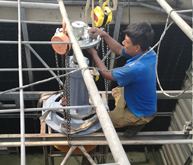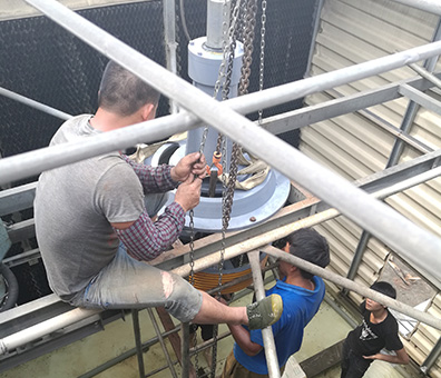4.用吊葫蘆把冷卻塔減速機(jī)吊上塔上,工作人員在上面扶正位置進(jìn)委維修。