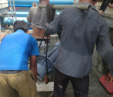 3.減速機(jī)重達(dá)到300公斤,因現(xiàn)場(chǎng)空間太小不能使用吊機(jī),四個(gè)維修師傅合力將冷卻塔減速機(jī)抬到塔底部